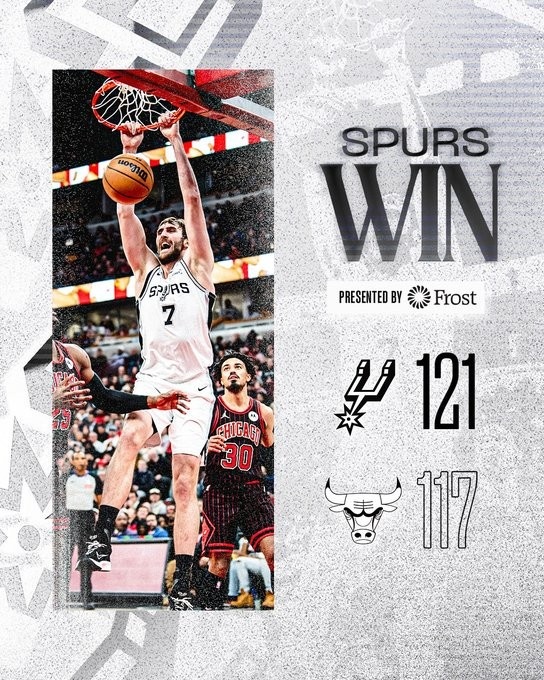 The Spurs narrowly defeated the Bulls 121-117 on the court. After the game, the team’s official Twitter released a winning poster, and Cornette’s dunk instantly became the cover. Cornet performed well in this game. He made 6 of 6 shots and 4 of 6 free throws in 20 minutes, scoring 16 points, 7 rebounds, 2 assists and 1 block.