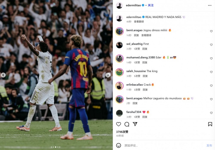 Real Madrid defeated Barcelona 2-1 in this round of La Liga's highlight match. Central defender Militao performed well. Statistics show that he not only sent 1 assist in this game, but also contributed 4 clearances and 4 steals and succeeded in 7 of 9 confrontations. He also posted a photo of himself celebrating on social media after the game with the text: "Real Madrid, no need to say more!"