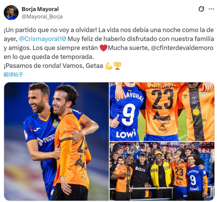Getafe forward Mayoral updated his social media updates and posted photos of competing with his brother. In the first round of the Copa del Rey, Getafe defeated the amateur team Valdemoro 11-0 in an away game. Mayoral scored twice. Mayoral's older brother Christian Mayoral plays for Valdemoro, and the two brothers competed together in this campaign. Mayoral posted a photo with his brother on social media, with the text: "A game I will never forget! Life owes us a night like last night. I am extremely happy to be able to share this wonderful time with my family and friends. Thank you for your consistent company." "I wish Valdemoro good luck in the remaining games of this season. We have advanced! Come on, Getafe!"