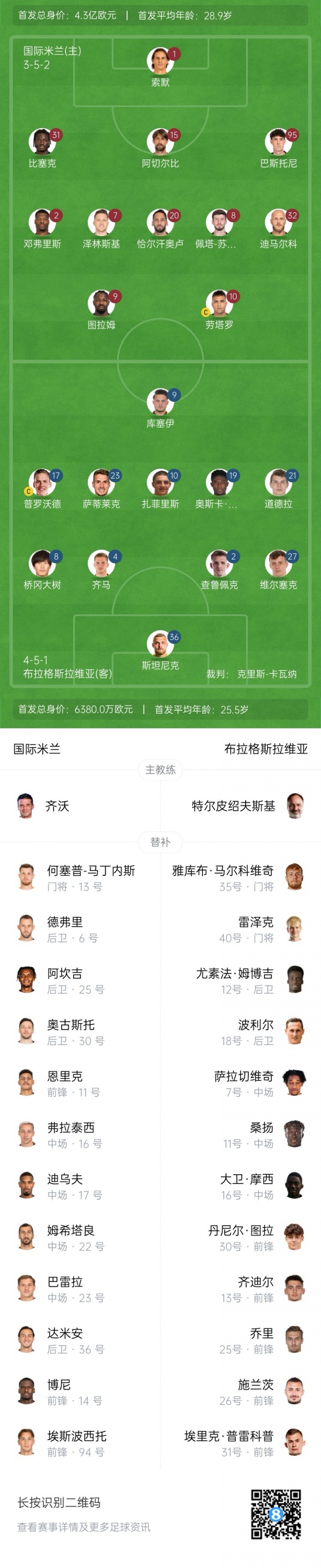 In the second round of the Champions League stage, Inter Milan faces Slavia Prague at home, and the pre-match starting list was announced. Inter Milan, compared with the previous game, only Bastoni started two consecutive games with six defenders, and all the other five were replaced. Midfielders Susic and Zelinsky replaced Mkhitaryan and Barrera in the previous game.