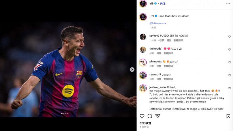 Barcelona beat Celta Vigo 4-2 in this La Liga away game, with Lewandowski scoring a hat trick in the starting lineup. In the 8th minute, Fermin's long shot caused Alonso's handball in the penalty area. VAR intervened and the referee personally reviewed the penalty kick. Lewandowski made a thrilling shot. In the 37th minute, Rashford sent a wonderful cross from the left corner of the penalty area, and Lewandowski shot past the goalkeeper. In the 73rd minute, Barcelona took a corner kick on the left. Rashford took the penalty and drove into the penalty area. Lewandowski jumped high and scored with a header. He also posted a photo of himself celebrating on social media after the game and captioned it: "...That's what we did @FC Barcelona ".