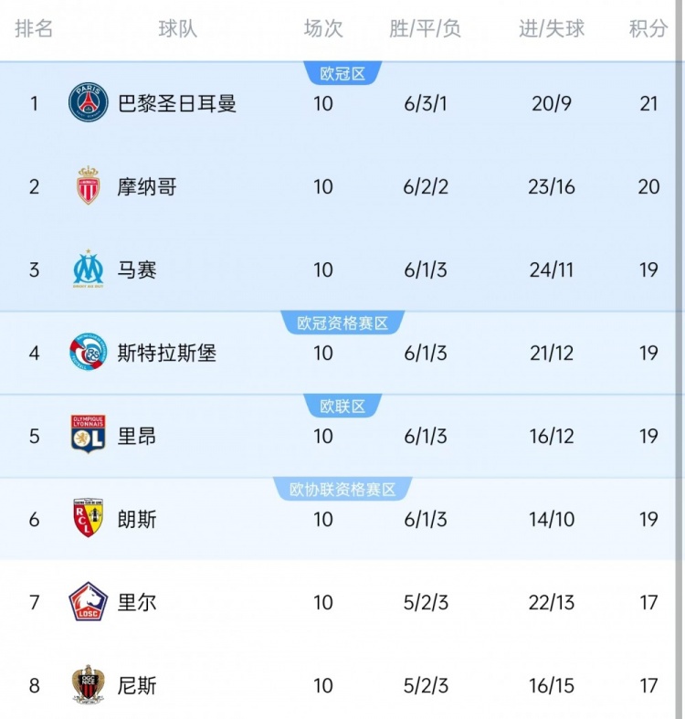 After 10 rounds of French Ligue 1, Paris ranks first with 21 points, but is only 2 points ahead of sixth-place Lens. According to Opta statistics, after the first 10 rounds of Ligue 1, the top 6 teams are only separated by 2 points. This is the smallest point difference between the top 6 teams in the same period since the 2010-2011 season (2 points difference in the first 15 rounds).