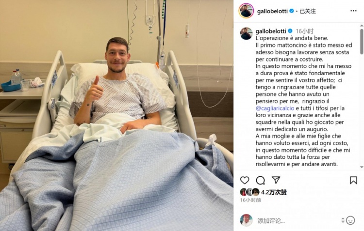 Belotti underwent knee surgery yesterday due to a cruciate ligament rupture. Belotti posted a photo of her post-operative smile on social media and wrote: "The operation is going smoothly. The first brick has been laid, and now we must work hard to continue building. In this difficult time, your love is crucial to me; I want to thank all those who care about me, the support of Cagliari Football Club and all the fans, and the blessings of all the teams I have played for." "Special thanks to my wife and daughters, who have been with me at all costs and give me all the strength to cheer up and continue moving forward." "Looking forward to reunion on the field, I would like to express my greetings, Belotti."