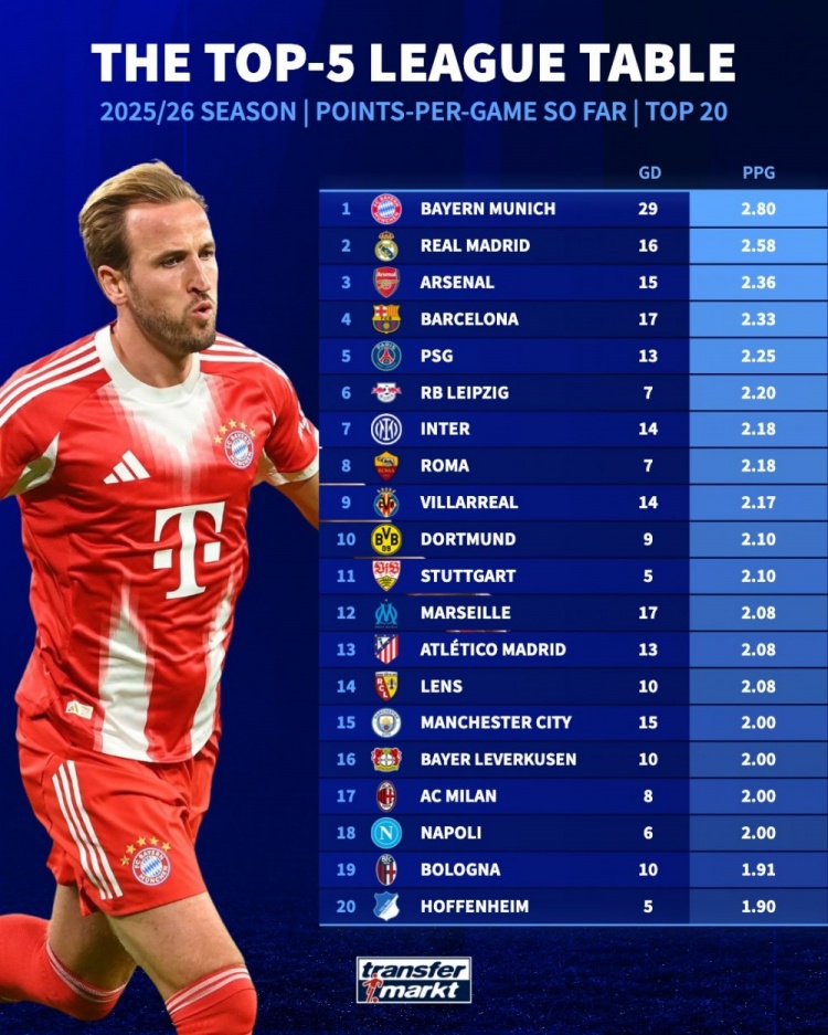 The war in the five major leagues is about to resume. "Transfer Market" also calculated the average points per game of the five major league teams this season, and Bayern alone leads the way. League average points per game this season: and goal difference 1. Bayern Munich, +29 goals, 2.80 points 2. Real Madrid, +16 goals, 2.58 points 3. Arsenal, +15 goals, 2.36 points 4. Barcelona, +17 goals, 2.33 points 5 .Paris Saint-Germain, +13 goals, 2.25 points 6. Leipzig, +7 goals, 2.20 points 7. Inter Milan, +14 goals, 2.18 points 8. Roma, +7 goals, 2.18 points 9. Villarreal, +14 goals, 2.17 points 10. Dortmund, +9 goals, 2.10 points 11. Stuttgart, +5 goals, 2.10 points 12. Marseille, +17 goals, 2.08 points 13. Atletico Madrid, +13 goals, 2.08 points 14. Lens, +10 goals, 2.08 points 15. Manchester City, +15 goals, 2.0 0 points 16. Leverkusen, +10 goals, 2.00 points 17. AC Milan, +8 goals, 2.00 points 18. Naples Stuttgart, +6 goals, 2.00 points 19. Bologna, +10 goals, 1.91 points 20. Hoffenheim, +5 goals, 1.90 points