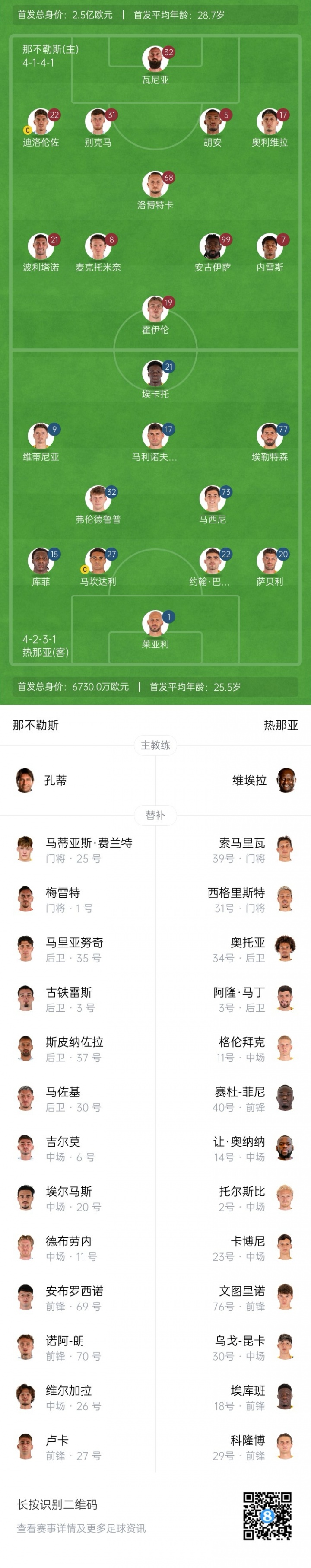 Naples substitutes: 1-Meret, 25-Matias Ferrante, 3-Gutierrez, 6- Gilmore, 30-Mazochi, 35-Marianaucci, 37-Spinazola, 11-De Bruyne, 26-Vergala, 20-Ermas, 27-Lorenzo Luca, 69-Ambrosino, 70-Noah Lang