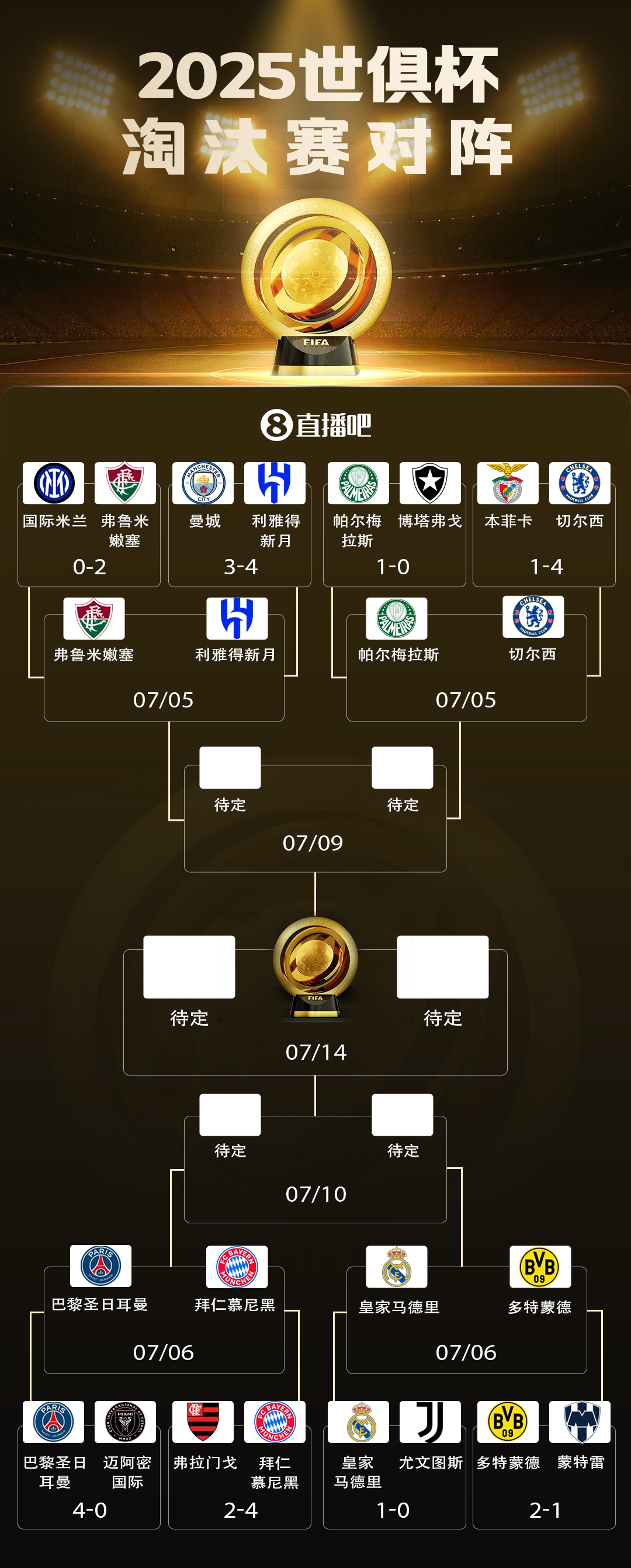 The results of the 8th club cup in the were released, and opta updated the probability of various giants advancing and winning the championship. Chelsea, who is in the upper half, has a chance of winning the championship, and the other four European teams are ranked 2-5. The data in the figure above are from the front to the back, the probability of the top 8, the probability of the top 4, the probability of the finals, and the probability of winning the championship. The probability of winning the Club Medieval Cup: 1, Chelsea 26.8% 2, Paris 24.9% 3, Real Madrid 16.9% 4, Bayern 14.8% 5, Dortmund 7.6% 6, New Moon 4.3% 7, Palmeiras 3% 8, Fruminense 1.5%