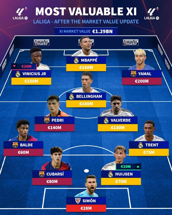 German transfer counted the most expensive 11 players in La Liga, Real Madrid 6 players on the list, Barcelona 4 players on the list, and the only player who is not Real Sa is Bilbao's goalkeeper Unai Simon. La Liga's most expensive 11-man lineup: Forward: Vinicius - 150 million euros, Mbappe - 180 million euros, Yamal - 200 million euros, Midfield: Pedri - 140 million euros, Bellingham - 180 million euros, Valverde - 130 million euros, defender: Valde - 60 million euros, Kubasi - 80 million euros, Heisen - 70 million euros, Arnold - 75 million euros, 3} Goalkeeper: Unai Simon - 28 million euros
