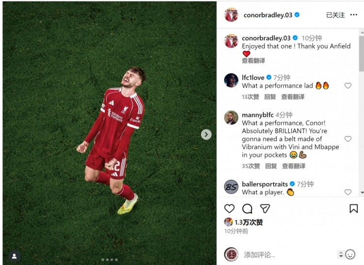 Voted the best in the team! Bradley social media: Enjoy the game, thank you Anfield